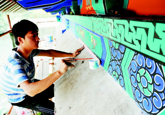 颜庙先于“三孔”通过批复,已于去年完成彩绘保护维修工程,这是工作人员在复原颜庙古建筑上的彩绘图案。 (资料片) 本报记者 李岩松 摄