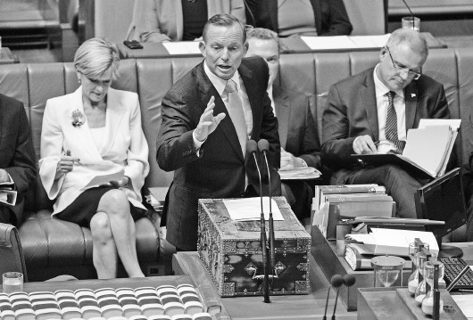 9日,澳大利亚总理阿博特(中)在堪培拉讲话。 新华/路透