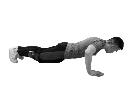 ①上肢俯卧撑。注意每次下落时,上下臂夹角为90°,感觉到胸部微微拉伸。每次10-20个。
