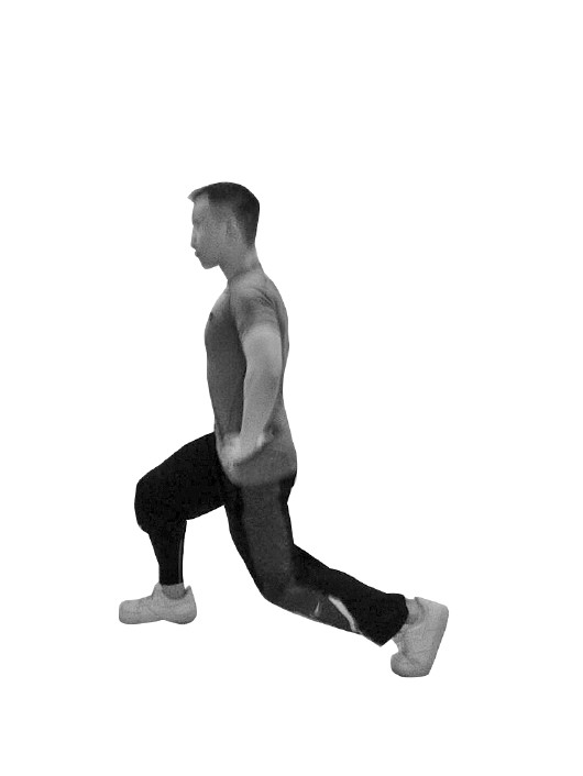 ③弓箭步。注意双脚不要在同一条直线上,两脚错开与肩同宽,向下蹲时大小腿呈90°,每次蹲起约两秒,不要太快,否则减弱锻炼的效果。每组10-15个。