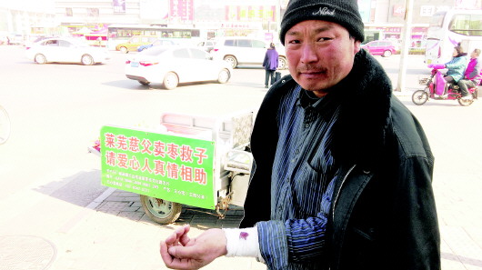 王心宝用食指蘸着血迹在泡沫板上写下了“莱芜农父卖艺救子,请好心人帮助”两行话,挂在了自己卖枣的三轮车上。写完后,王心宝没有去医院消毒,而是到附近的药店买来纱布自己裹了一下。纱布上渗出指甲大小的血滴,王心宝割腕的位置离脉搏处仅有一指。