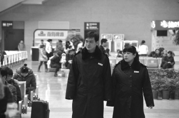 夫妻两人在候车厅查看是否有需要帮助的旅客。