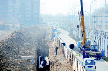 2月9日,岔河滨河东大道施工人员正在铺设地下管道,赶在春季绿化前完成地下施工。 本报记者 马志勇 摄