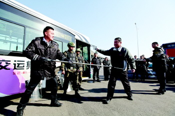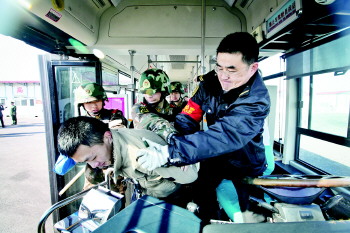 有人在公交车内袭击司机,胡乱打砸,上演“全武行”,执勤官兵接警后迅速赶到将其控制并带离……为保证春运期间公交运输安全,及时处理突发事件,9日,在青岛北站,交运温馨巴士联合武警李沧边防大队,设立“警企共建工作室”。武警警官现场教授驾驶员如何使用警棍、防暴叉等装备,还对公交车应对持械袭击等事件进行了演习。