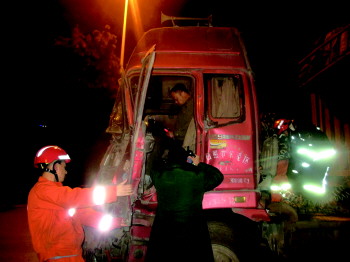 本报2月9日讯(见习记者 隋忠伟 通讯员 陈祥光) 2月8日凌晨5时46分,日照市公安消防支队五莲县大队接到报警称:五莲县滨河路与北京路交汇处发生货车相撞事故,一人被困驾驶室,急需救援。接到报警后,大队立即派两辆消防车,12名官兵紧急赶赴现场进行救援。