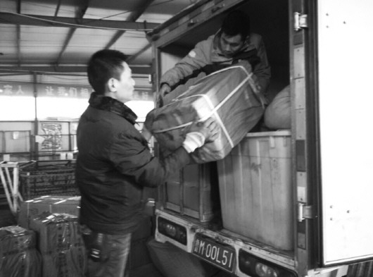 快递员正将快件装到小货车上。本报记者 刘哲 摄