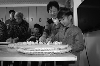 9日上午,在菊花顶社区日间照料站,社区工作人员、小学生和居民一起包饺子,饺子煮熟后,大家将饺子送给独居老人。