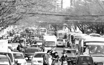 2月9日下午三点左右,城区利民路铁塔商场附近,人车夹杂造成拥堵。据了解,临近年关,不少人来商场购买年货,再加上该路段不少商贩占道摆摊造成拥堵。 本报记者 邹俊美 摄