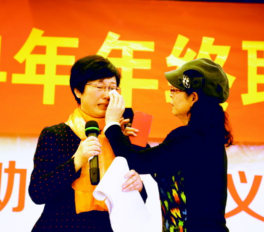 在烟台扬帆助学慈善义工队2014年年会上,负责人薛志伟谈起一年里资助过的孩子,几度落泪。 本报记者 韩逸 摄