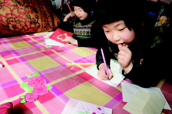 为了感谢好心的阿姨,双胞胎姐妹动手写起了感谢信和贺卡。 本报记者 李泊静 摄