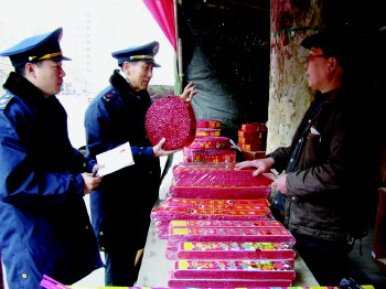 10日,周村区工商局工作人员在一烟花爆竹摊点前进行检查。春节将至,周村区工商局组织人员对烟花爆竹市场进行专项检查,重点查验业户手续是否齐全,商品来源是否正规,同时,督促经营户严格落实烟花爆竹存储管理制度。截至目前,该局已检查烟花爆竹经营业户23户,督促办照5户,责令整改1户。