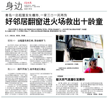 2014年7月30日7时许,市南区汶上路7号贾先生家中因管道燃气泄漏导致爆炸燃烧。贾先生被巨大的气浪从三楼阳台抛出,其11岁儿子被浓烟烈焰围困在另一间卧室里。而家中大门被爆炸的气流紧紧卡死,无法从外面打开实施救人,且随时有二次爆炸的危险。紧急关头,邻居赵希勇冒着生命危险从自家阳台徒手攀爬到贾先生家,冒着浓烟烈焰将孩子救出并及时抱到自家阳台,孩子这才得以脱险。