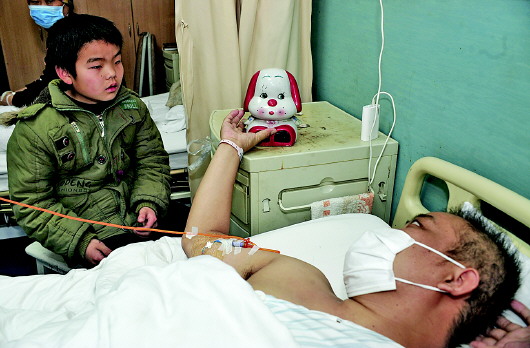 小延彬的父亲看着儿子的存钱罐,泪水流出。本报记者 张中 摄