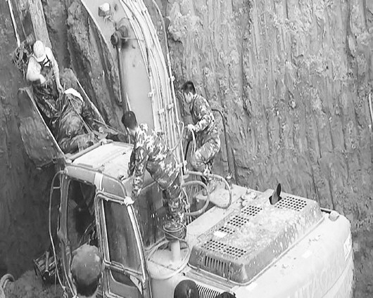 救援人员清理完井口周围的石块后,向井下放入压缩空气瓶,向井底输送空气,同时调派大型挖掘机赶来救援。因深井周围不断有积水渗出,并伴有土块塌陷,无法安排人员下井施救。救援人员使用三台挖掘机逐层下挖,清除深井周围的泥土。
