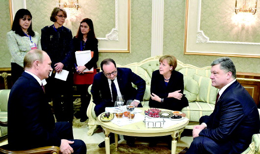 2月11日,在明斯克,(沙发上左起)普京、奥朗德、默克尔及波罗申科交谈。 新华/美联