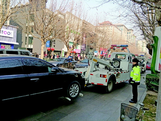 违停车辆被交警用拖车拖离现场。    本报记者 王兴飞 摄