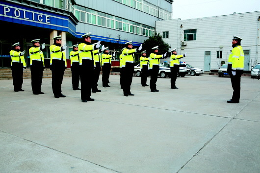 春节临近,为保证长清市民度过一个安全祥和的春节,长清交警大队强化冬季练兵,开展“七种违法行为”集中整治专项行动。2月8日,长清交警大队组织各勤务中队值班民警举行了应急处突演练。图为民警正在进行手势规范演练。