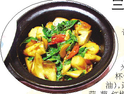 三杯杏鲍菇,再搭配上银杏果,更加健康养生,清爽可口,回味无穷。所谓“三杯”,指的是一种烹饪调味技巧,就如同“红烧”一样,即一杯米酒(可用低度白酒代替),一杯酱油,一杯胡麻油(或芝麻油),还有不能少的五鲜——姜、蒜、葱、红椒和九层塔(或香菜),调料还有糖。只要把主材料用这三杯烧熟,自然喷香好吃。