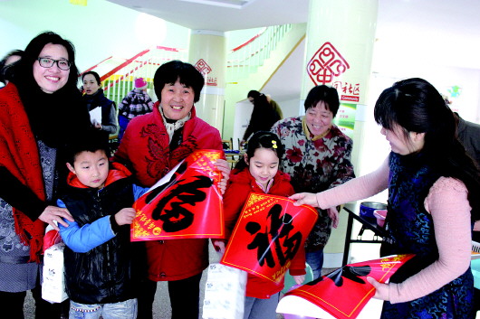 由本报定制的“福”字发到居民手中。本报记者 崔岩 摄。