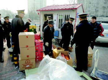 11日,在重庆南路上,市北城管执法人员取缔一处违法鞭炮摊,其中还有不少存在安全隐患的土鞭。当日,市北城管取缔违法鞭炮摊20余处,暂扣非法鞭炮8箱。春节期间,城管执法人员将对道路、广场及市场等区域违法经营行为重点巡查。