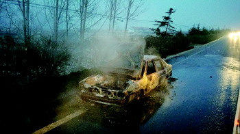 下图:火扑灭了,但车已经被烧得面目全非。