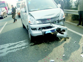 一辆面包车车头被撞烂。  本报通讯员 王军 摄