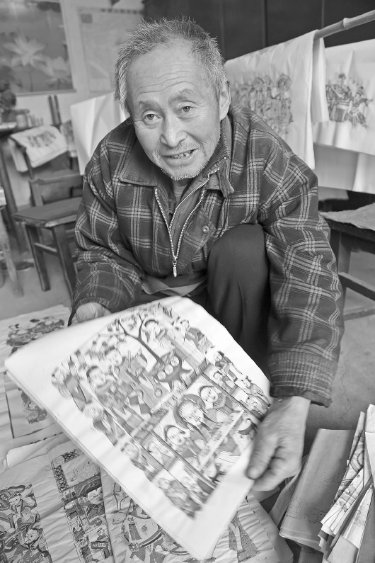 ◥春节将至,聊城东昌府木版年画手工艺人荣维臣正在赶制年画。相比前些年,前来订购年画的客户少多了。