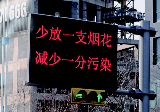 13日下午,市民张清(化名)开车走在经十路上看到,红绿灯上方的交通指示电子屏变了样。“出现了‘少放一支烟花,减少一分污染’几个大字,这样倡议少放烟花爆竹的方式很是醒目。”