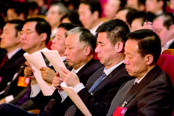 李群等主席团常务主席在主席台就座,王文华主持,张新起作政府工作报告,近两年GDP增长目标连续下调