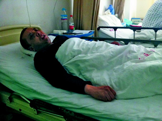 13日,记者在山东省交通医院的骨外科见到了刘师傅。他躺在床上,右眼乌青,右手臂上有着明显的抓痕。