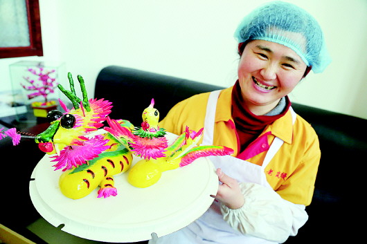 龙口市东江镇邵家村的李瑞英是远近闻名的面塑高手。龙、凤、老虎、丹顶鹤、鸳鸯、牡丹花、樱桃、仙女、蝈蝈、哪吒、仙桃、小燕子……在李瑞英手里,这些面塑造型简直都能活起来。