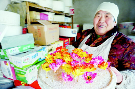 “我也没有专门学过,平时看见什么了,好好琢磨琢磨,然后回家做出来。”李瑞英说,她做的面塑也有讲究,什么季节用什么花,春天做牡丹,夏天做荷花,秋天做菊花,冬天做梅花,此外还有玫瑰花、杜鹃花、喇叭花等,“有一次一个老人过寿,我给他三个女儿分别做寿桃,用了27种不同的花。”
