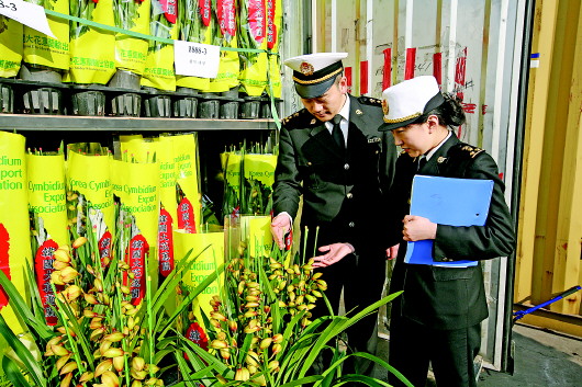 15日,青岛大港海关关员正在为一批从韩国进口的花卉快速办理通关手续。据悉,随着春节临近,进口花卉需求量猛增,而运输时间、装卸交接等对进口花卉存活率影响较大。为最大程度缩短通关时间,青岛大港海关开辟“绿色通道”,确保进口鲜花如期满足春节市场需求。