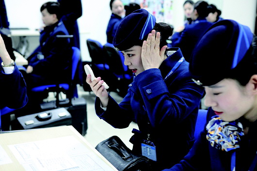 5点35分,天还未亮,一早要出港航班的机组成员已经到了机场。飞行准备室里摆放了密密麻麻的飞行资料,飞行员在同工作人员交流后领取自己的飞行资料以及飞行任务书后,准备出发前往候机楼登机。隔壁的客舱航前准备室中,每个桌前都坐满了正准备出发的乘务组。一名“鲁雁乘务组”乘务员在出发前再次检查自己的妆容是否得当。