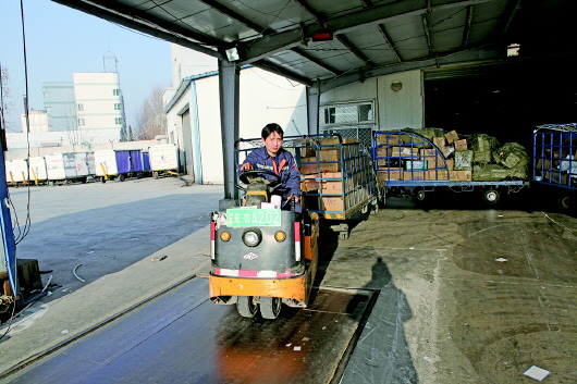 ▲早上7点多,正是航班出港的高峰期,山航货运员工将行李和货物依次放入飞机货舱中。他们要赶在飞机起飞前将每件货物准确、平稳地装卸完。早上8点,机场的东北边,山航货运部,刚刚度过货运高峰期的员工们有了片刻休息时间。他们的工作,从凌晨5点多开始,一直要忙到下午4点以后。这会儿,一位货运人员正将下一批要装机的货物用小车拉到地磅秤上称重。