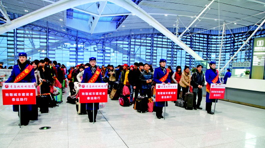 为方便务工人员顺利乘车,济南铁路局青岛站为他们发放了“阳光服务提示卡”,使他们及时掌握车次时刻、进站径路、候车分区等信息。考虑到务工人员携带行李比较多、进站不方便的情况,他们在青岛北站、青岛站进站口分别开辟了4条务工人员团体进站专用通道,安排青年志愿者帮助提拿行李,引导经专用通道快速安检进站。在火车站候车室开辟了“务工人员候车专区”,组织文艺小分队为他们进行文艺慰问演出,并现场为他们赠送回家的礼物,向为城市建设默默奉献的外来务工人员送上浓浓的祝福,受到他们的欢迎。