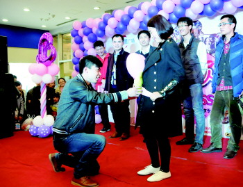 随后,刘晓亮单膝跪地为心爱的女友戴上了钻戒,赢得了全场嘉宾的欢呼。