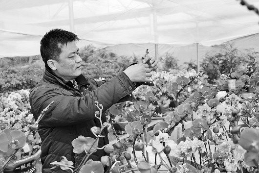 2月14日,记者在“开轩庄园”见到了孙传德,春节前正是蝴蝶兰的旺销期,孙传德每天天刚亮就会去花棚里忙活。图为孙传德整理花枝。