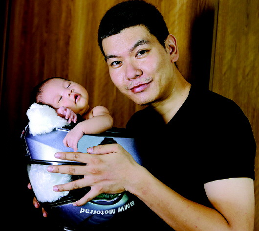 2014年9月6日,宝宝满月,放进心爱的头盔中合影。