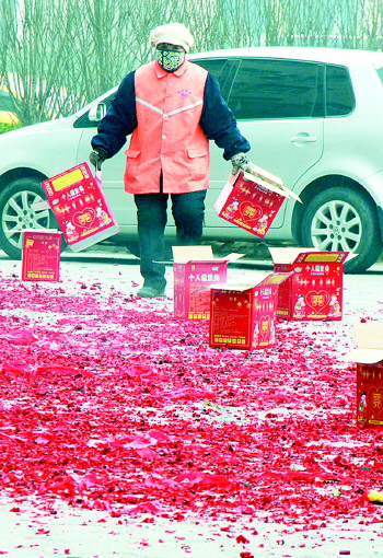 25日,在街头打扫卫生的环卫工刘女士说,自正月初二以来,很多市民和商家在街头燃放烟花爆竹,从清晨到中午鞭炮声几乎不断。“春节期间放鞭炮的特别多,一天下来,一条路要来来回回打扫好几趟。”刘女士说,平时她清扫的路段一天也就清理出两车垃圾,春节期间每天差不多都能清扫出四五车垃圾。