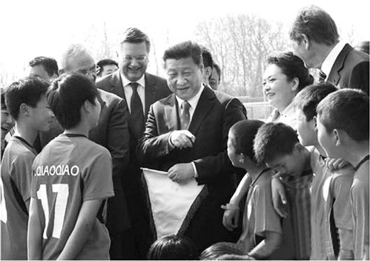2014年3月29日,习近平在柏林看望在德国训练的中国少年足球运动员。(资料片)