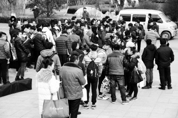 大量考生在考场外候考。 本报记者 孙国祥 摄.