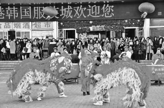 3月1日,在威海老港韩国商品城门口,开业的商家聚集于此。据介绍,往年都是各商户燃放鞭炮庆祝,今年商场聘请了舞狮团队表演,避免燃放鞭炮污染空气。