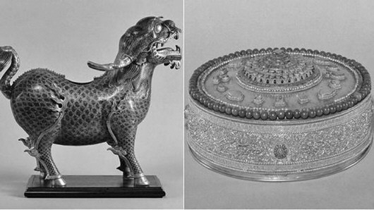 在这家博物馆内,最为人知的一件藏品就是圆明园的景泰蓝麒麟,它于1860年“火烧圆明园”后被掠夺并流失海外。不幸的是,这件文物也在此次失窃之列。另外一件被窃文物是金曼扎,这也是一件非常重要的中国文物精品。金曼扎是藏传佛教的寺庙摆设品,金罐通体如意花纹闪闪发光,并镶有珍珠、绿松石等多种宝石,非常奢华。