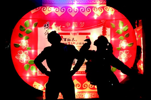 1日晚,在趵突泉花灯会上,两名年轻人在“中国梦”花灯前憧憬自己的未来……随着正月十五的临近,济南各大公园和街头巷尾的花灯逐渐亮了起来,造型新颖的花灯为节日的泉城平添几分靓丽。 本报记者 左庆 摄