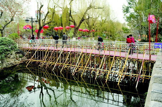 趵突泉公园内搭建起了5座临时浮桥。见习记者 高寒 摄