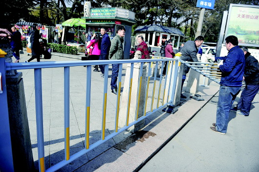 2日,趵突泉公园门口,工作人员正在安装护栏,这些护栏在灯会结束后再撤掉。 本报记者 王媛 摄