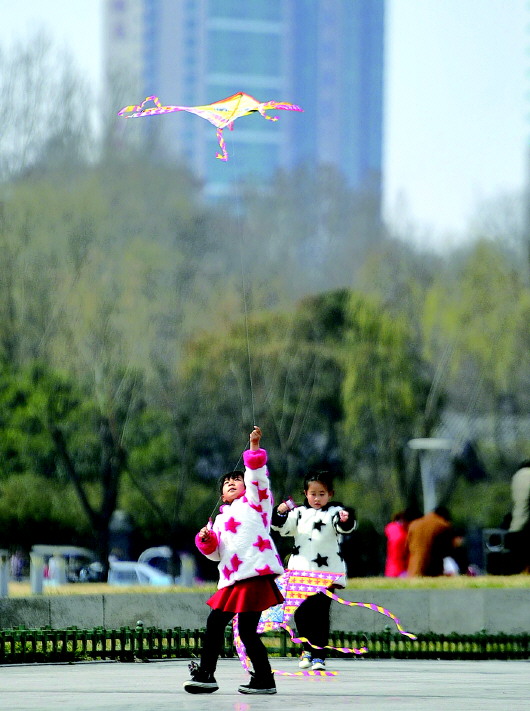 2日,泉城广场上,孩子们正在放飞手中的风筝。当日济南最高气温达到15℃,不少市民带着孩子出来享受春光。 本报记者 王媛 摄