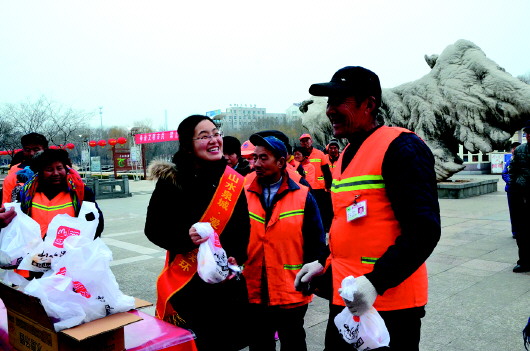 2月28日,百脉泉公园门口,山水泉城工作人员给环卫工人送来过节的元宵,让“城市美容师”们感到一丝温暖。