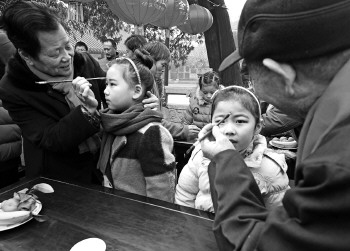 在孟府大堂前,道德模范们和20名学童一起参与开笔启蒙礼。司仪现场讲述了丈夫与前妻三个孩子培养成才的“感人后妈”杜祥玉、全心奉献农村教育事业的乡村教师仲维柯等的真实故事。随后,道德模范依次起身提笔,为20名刚刚入学的学童进行眉心“朱砂启智”。